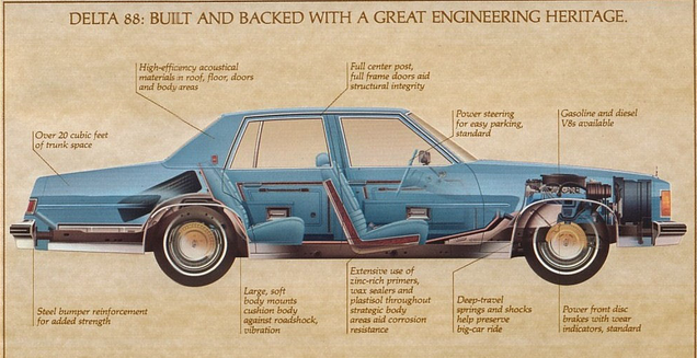 Late ‘70s and early ‘80s GM full-sized sedans sure had massive trunks, but I forgot about the spare tire location: jammed up way towards the back, at an angle. Not only was this not terribly space-efficient, but I think getting it out to change a flat with a trunk full of luggage would be even more of an ass-pain than…